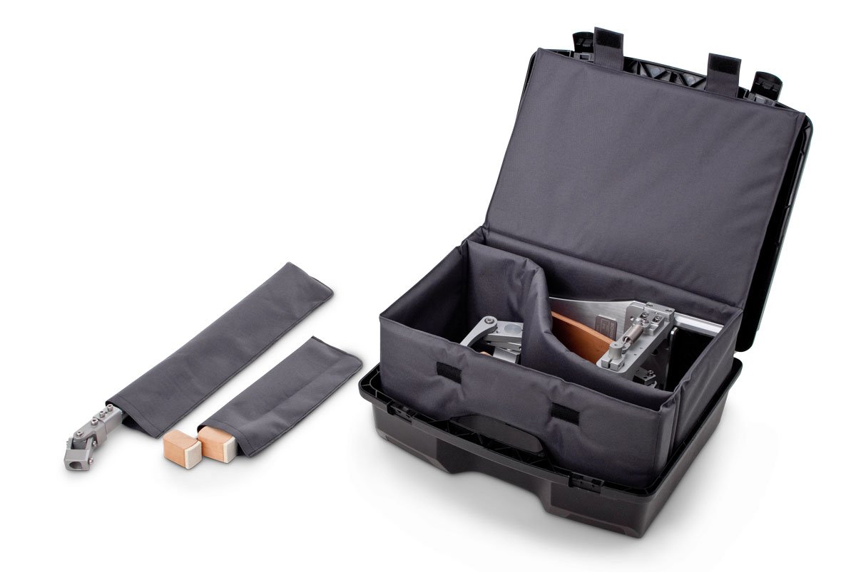 Hauptpedal, Nebenpedal und verstellbare Kardanwelle inkl. Transportkoffer mit Stoff-Innentasche, Kardanwellentasche und Schlägeletui,Sechskantschlüssel 3mm/4mm mit Halterung, spielbereit voreingestellt